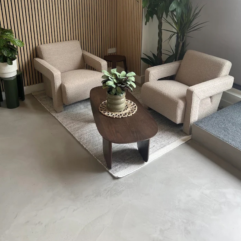 The completed studio provides a calm, contemporary environment that supports precision, movement and wellbeing. The combination of herringbone LVT and microtopping delivers a durable, low-maintenance finish, while maintaining a refined, design-led look.
